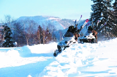 官兵駕乘摩托雪橇巡邏在邊防線上