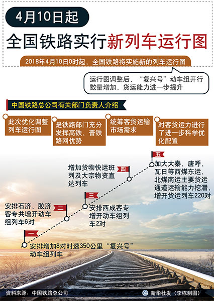 2018年4月10日0時(shí)起,全國(guó)鐵路將實(shí)施新的列車運(yùn)行圖。運(yùn)行圖調(diào)整后,“復(fù)興號(hào)”動(dòng)車組開(kāi)行數(shù)量增加,貨運(yùn)能力進(jìn)一步提升。新圖實(shí)施后,北京至上海間通過(guò)壓縮停站,實(shí)現(xiàn)最快4小時(shí)18分可達(dá),較調(diào)圖前壓縮6分鐘。>>>