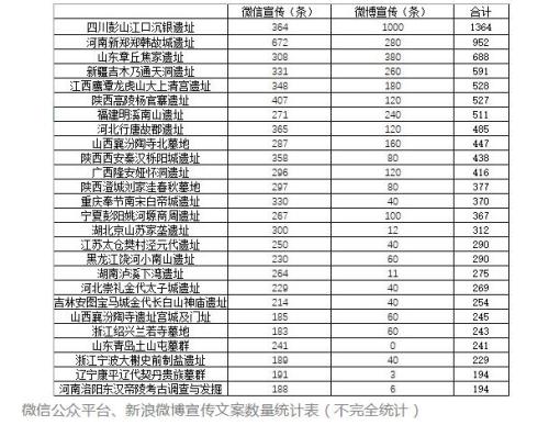 在“2017年度全國十大考古新發(fā)現(xiàn)”前一天,這篇文章對26項入圍“2017年度全國考古十大新發(fā)現(xiàn)”項目的網(wǎng)絡(luò)宣傳文案數(shù)量進(jìn)行了統(tǒng)計。胡宇煊在統(tǒng)計了微信公眾平臺、新浪微博宣傳文案數(shù)量后,對這26個項目進(jìn)行排序,并大膽預(yù)測了2017年度全國考古十大新發(fā)現(xiàn)的評選結(jié)果。