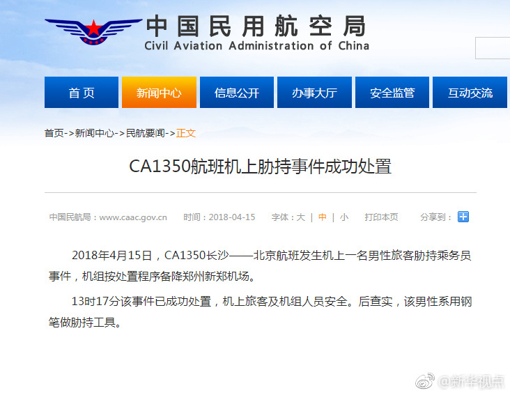 新華網(wǎng)北京4月15日電 民航局官網(wǎng)消息:2018年4月15日,CA1350長沙——北京航班發(fā)生機(jī)上一名男性旅客脅持乘務(wù)員事件,機(jī)組按處置程序備降鄭州新鄭機(jī)場。13時17分該事件已成功處置,機(jī)上旅客及機(jī)組人員安全。后查實(shí),該男性系用鋼筆做脅持工具。(據(jù)新華社“新華視點(diǎn)”微博報(bào)道) ?????