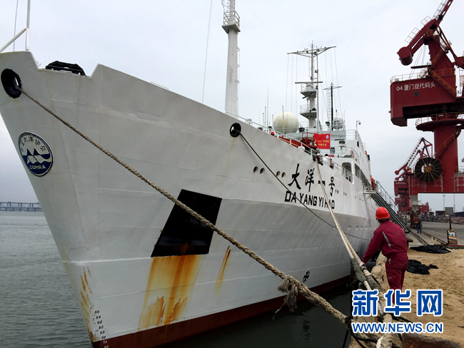 ??? 這是4月15日拍攝的??吭趶B門(mén)現(xiàn)代碼頭的“大洋一號(hào)”科考船。當(dāng)日,搭載“潛龍三號(hào)”無(wú)人無(wú)纜潛水器和70名科考隊(duì)員的“大洋一號(hào)”科考船從廈門(mén)起航,奔赴南海執(zhí)行“大洋一號(hào)”綜合海試B航段科考任務(wù)。這也是目前我國(guó)最先進(jìn)的自主無(wú)人潛水器“潛龍三號(hào)”首次出海。新華社記者 劉詩(shī)平 攝