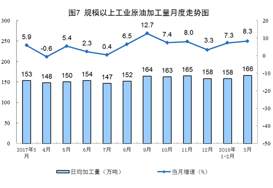受去年下半年國內(nèi)新增煉化產(chǎn)能陸續(xù)投產(chǎn)和2018年首批原油進(jìn)口配額大幅增加影響,一季度原油加工量明顯增長,同比增長7.5%,增速比去年同期加快3.0個(gè)百分點(diǎn)。3月份,原油加工量同比增長8.3%,日均加工166.2萬噸,為歷史最高水平。其中,汽油、煤油和柴油產(chǎn)量分別增長5.7%、14.6%和1.3%。