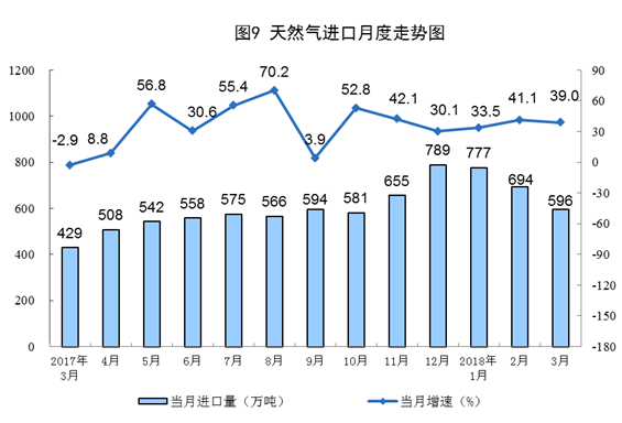 天然氣進(jìn)口高速增長。一季度,進(jìn)口天然氣2062萬噸,同比增長37.3%。3月份,進(jìn)口天然氣596萬噸,同比增長39.0%,增速比1-2月份放緩2.1個(gè)百分點(diǎn)。