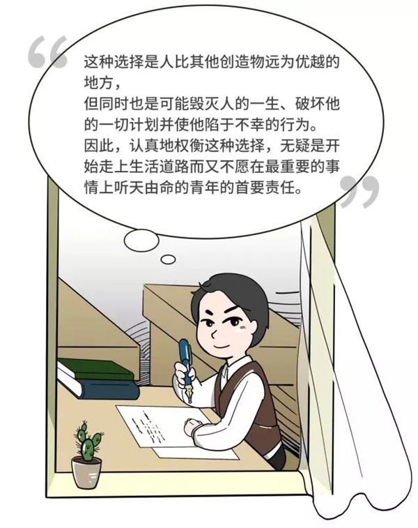 “這種選擇是人比其他創(chuàng)造物遠為優(yōu)越的地方,但同時也是可能毀滅人的一生、破壞他的一切計劃并使他陷于不幸的行為。因此,認真地權(quán)衡這種選擇,無疑是開始走上生活道路而又不愿在最重要的事情上聽天由命的青年的首要責任。”