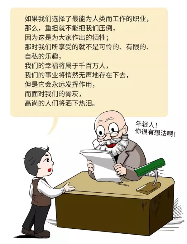 這是非常有名的一段話,從這段話中,我們可以很明顯看出,馬克思這里的討論已經(jīng)遠遠地超出了世俗的職業(yè)范圍,他實際上講的是理想信念和人生志向。