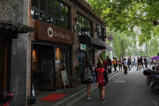 游客從“初心”咖啡館的門前經(jīng)過??拷贾菽仙铰返摹俺跣摹笨Х瑞^以前是“東籬會(huì)所”,如今成了別有風(fēng)味的大眾咖啡館。新華社記者 黃宗治 攝