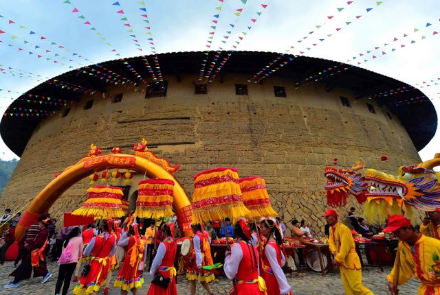 人們在福建省華安縣仙都鎮(zhèn)大地土樓群的“土樓之王”——二宜樓里舉行“三月三”民俗文化活動(dòng)。 新華社記者 魏培全 攝