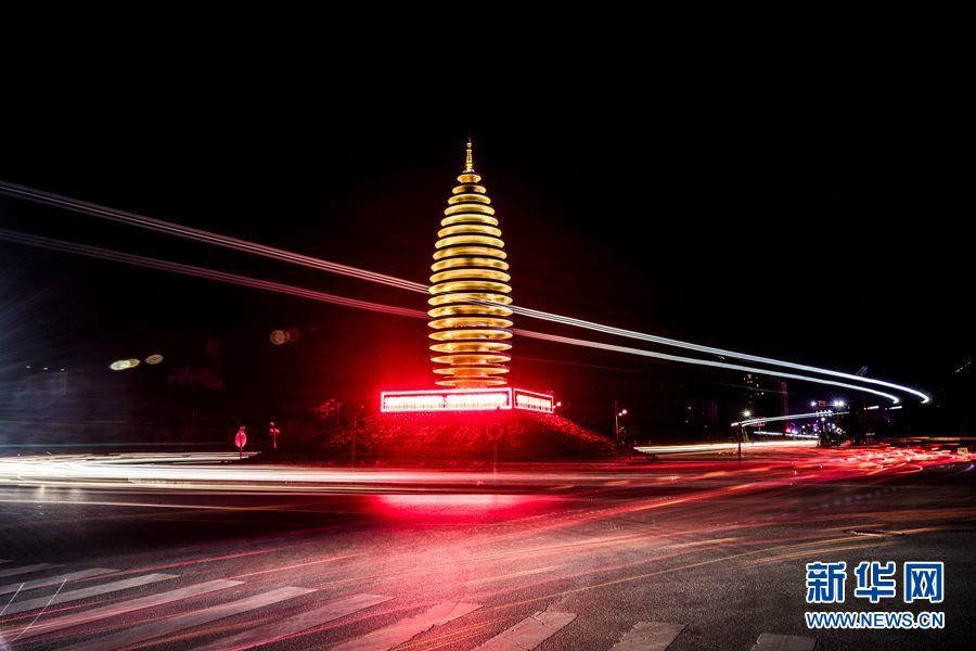夜幕中容城縣地標(biāo)建筑容和塔,大車車頂燈駛向奧威路后,在夜空留下一道絢麗的光。中國雄安官網(wǎng)記者 王永康 攝