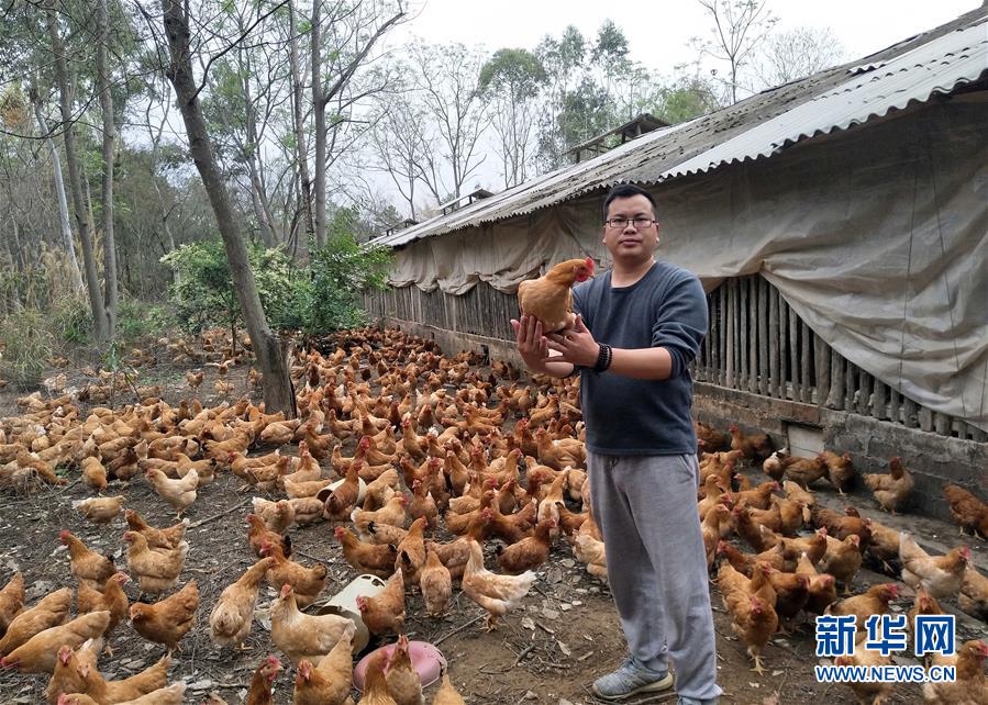 在江西省定南縣雞卿寨生態(tài)蛋雞合作社,“一村一名大學(xué)生”工程學(xué)員李良華在基地展示放養(yǎng)的生態(tài)蛋雞(3月17日攝)。新華社發(fā)