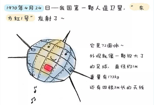 1970年4月24日,我國成功發(fā)射第一顆人造地球衛(wèi)星“東方紅1號(hào)”。衛(wèi)星運(yùn)行軌道,距地球最近點(diǎn)四百三十九公里,最遠(yuǎn)點(diǎn)二千三百八十四公里,軌道平面和地球赤道平面夾角六十八點(diǎn)五度。繞地球一周一百一十四分鐘。衛(wèi)星重一百七十三公斤。該衛(wèi)星發(fā)射成功標(biāo)志著中國成為世界上第五個(gè)用自制火箭發(fā)射國產(chǎn)衛(wèi)星的國家。