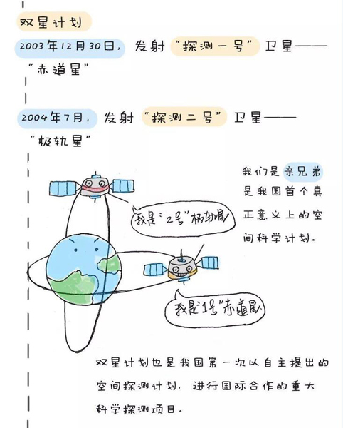 2003年12月30日,中國與歐洲空間局的合作項(xiàng)目“地球空間雙星探測計(jì)劃”中的第一顆衛(wèi)星“探測一號(hào)”成功發(fā)射。這是中國第一次發(fā)射高軌道衛(wèi)星,標(biāo)志著中國高水平的空間物理與環(huán)境探測進(jìn)入實(shí)質(zhì)性發(fā)展階段。2004年7月,“探測二號(hào)”衛(wèi)星升空,與已在軌運(yùn)行的“探測一號(hào)”衛(wèi)星構(gòu)成了具有創(chuàng)新特色的星座式獨(dú)立探測體系。兩顆衛(wèi)星互相配合,分別運(yùn)行于目前國際上地球空間探測衛(wèi)星尚未覆蓋的重要空間活動(dòng)區(qū)域,主要進(jìn)行太陽活動(dòng)、行星際擾動(dòng)觸發(fā)磁層空間暴和災(zāi)害性地球空間天氣的物理過程等科學(xué)研究。