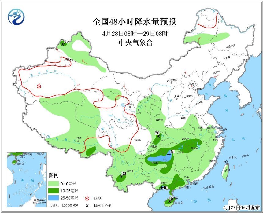 北方地區(qū),以多云為主。不過,29日,華北地區(qū)北部、東北地區(qū)中南部將有小雨或陣雨。5月1日,內(nèi)蒙古東部、東北地區(qū)中南部、黃淮、華北南部有小到中雨。上述部分地區(qū)伴有雷電等強(qiáng)對流天氣。4月29日,京津冀中南部地區(qū)有霾。30日,隨著冷空氣的到來,霾會逐漸減弱消散。