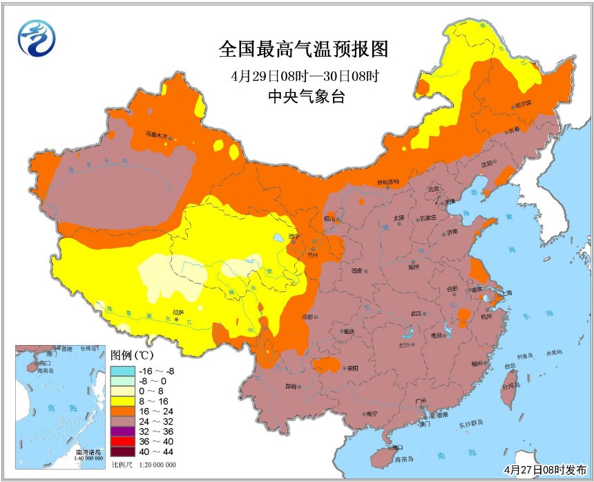 方翀:29日是“五一”小長假第一天,華北至黃淮大部地區(qū)氣溫將達(dá)29-30℃。30日起,冷空氣將影響中東部,北方氣溫將有所下降,降溫幅度在4-6℃左右,南方降溫不明顯,華南地區(qū)較為悶熱。