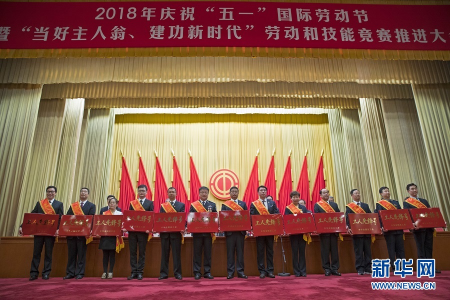 4月28日,榮獲全國工人先鋒號的部分集體代表在大會上合影。當(dāng)日,2018年慶?!拔逡弧眹H勞動節(jié)暨“當(dāng)好主人翁、建功新時代”勞動和技能競賽推進大會在北京人民大會堂舉行。 新華社記者 才揚 攝