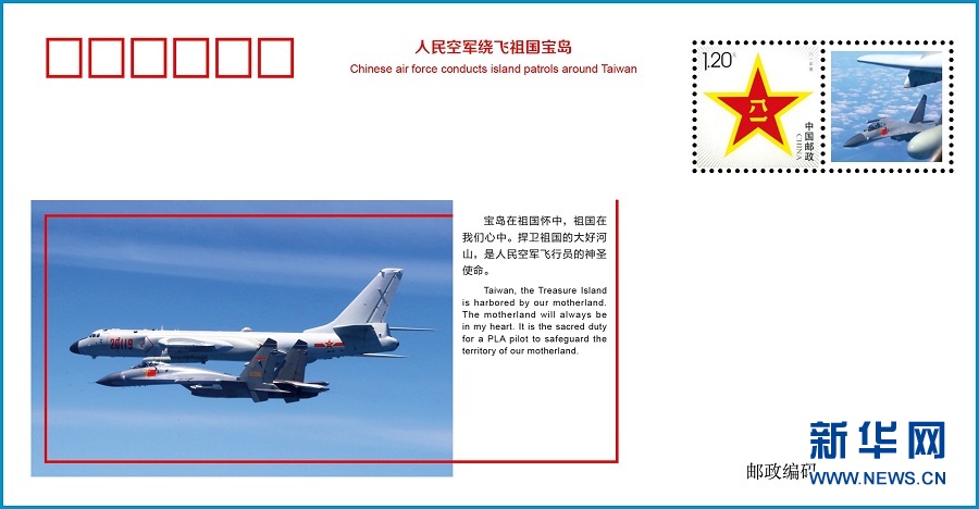 紀念封、宣傳片所用戰(zhàn)機巡航影像,均為人民空軍飛行員執(zhí)行繞島巡航任務(wù)中航拍的?!皩殟u在祖國懷中,祖國在我們心中。捍衛(wèi)祖國的大好河山,是人民空軍飛行員的神圣使命?!保访都o念封傳遞了空軍飛行員這一共同心聲。