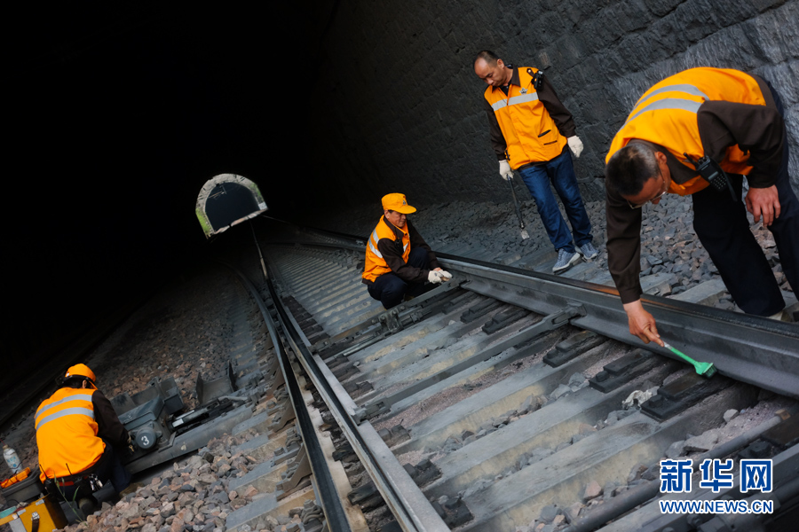 鐵路職工在隧道作業(yè)。他們的工作被稱為“改道”,要把兩條鐵軌距離與標(biāo)準(zhǔn)數(shù)據(jù)的誤差控制在-2mm到+6mm之間。新華網(wǎng)陳俊松 攝