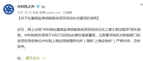 近日,網(wǎng)上出現(xiàn)“中科院釷基熔鹽堆核能系統(tǒng)項目啟動儀式上道士做法驅(qū)邪”相關信息。中科院相關領導于4月27日獲知此事后高度重視,立即要求院機關職能部門和該項目承擔單位中科院上海應用物理研究所(簡稱“上海應物所”)嚴肅對待、及時發(fā)聲。
