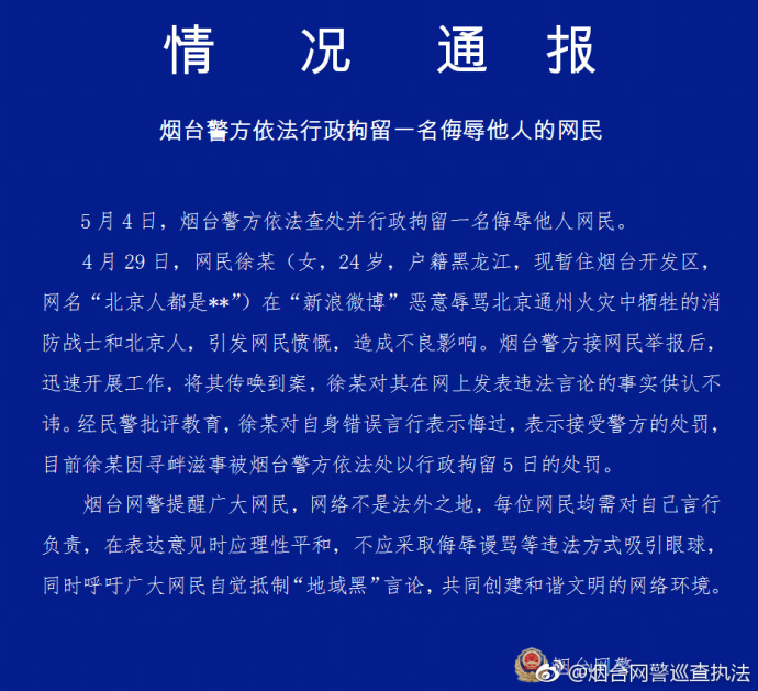 山東省煙臺市公安局網(wǎng)絡安全保衛(wèi)支隊官方微博今日發(fā)布情況通報。通報稱,一女子在微博惡意辱罵北京通州火災中犧牲的消防戰(zhàn)士和北京人,造成不良影響,因尋釁滋事被煙臺警方依法處以行政拘留5日的處罰。