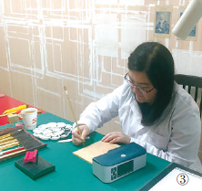 無影燈下,大大小小的毛筆、毛刷整齊排列,調(diào)色盤中墨色深淺不一,一臺小型分色測試儀隨時“待命”;桌上有根據(jù)文物原件打印出來的精細放大圖像和色彩分析數(shù)據(jù);右手邊是帶有通風裝置的操作臺;房間盡頭處有帶過濾架的水槽,專供清洗印染后的紙張……