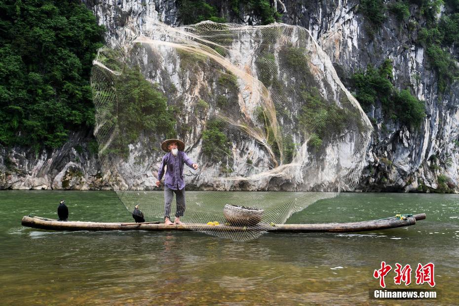 79歲的黃月創(chuàng)正在表演漓江傳統(tǒng)漁事。中新社記者 俞靖 攝