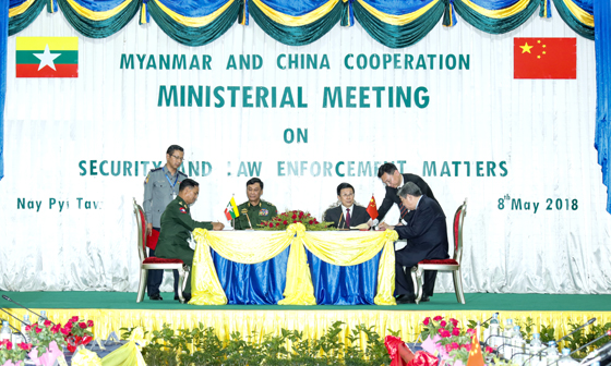 5月8日,國務(wù)委員、公安部部長趙克志在內(nèi)比都與緬甸內(nèi)政部部長覺瑞舉行會談。圖為會談后,雙方簽署有關(guān)合作文件。