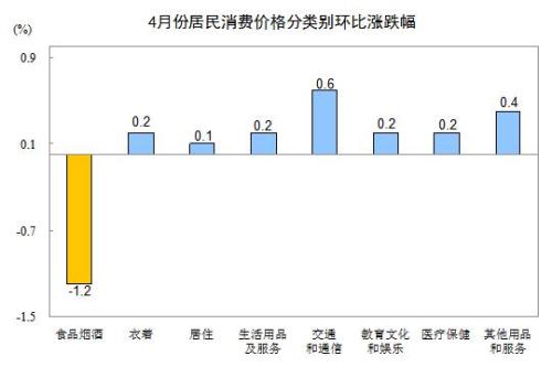 4月份,全國(guó)居民消費(fèi)價(jià)格環(huán)比下降0.2%。其中,城市下降0.2%,農(nóng)村下降0.3%;食品價(jià)格下降1.9%,非食品價(jià)格上漲0.2%;消費(fèi)品價(jià)格下降0.5%,服務(wù)價(jià)格上漲0.3%。