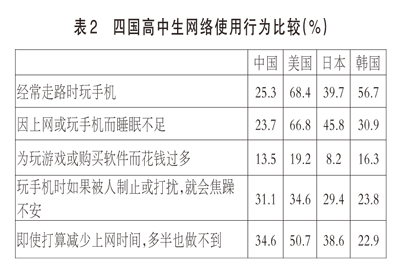 如果中學(xué)生的在線(xiàn)活動(dòng)影響了現(xiàn)實(shí)生活,并引發(fā)沖突,就需要給予引導(dǎo)。由表2的數(shù)據(jù)可見(jiàn),25.3%的中國(guó)高中生經(jīng)常走路時(shí)玩手機(jī),低于其他三國(guó),美國(guó)、韓國(guó)和日本依次為68.4%、56.7%和39.7%;23.7%的中國(guó)高中生因上網(wǎng)或玩手機(jī)而睡眠不足,低于其他三國(guó),美國(guó)、日本和韓國(guó)依次為66.8%、45.8%和30.9%;13.5%的中國(guó)高中生因玩游戲或購(gòu)買(mǎi)軟件而花錢(qián)過(guò)多,在四國(guó)中居第三,美國(guó)和韓國(guó)依次為19.2%和16.3%,分別比中國(guó)高5.7和2.8個(gè)百分點(diǎn),日本為8.2%,比中國(guó)低5.3個(gè)百分點(diǎn)??梢?jiàn),美國(guó)高中生網(wǎng)絡(luò)行為影響現(xiàn)實(shí)生活的最多,而中國(guó)高中生比較理性。