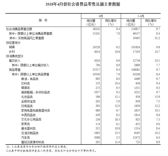 據(jù)國家統(tǒng)計局網(wǎng)站消息,2018年4月份,社會消費品零售總額28542億元,同比名義增長9.4%(扣除價格因素實際增長7.9%,以下除特殊說明外均為名義增長)。其中,限額以上單位消費品零售額11241億元,增長7.8%。