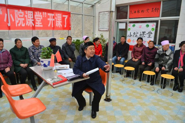 新村沒有專門的黨支部活動地點(diǎn),馬奶奶就把自己家變成黨支部。2017年8月份,黨的十九大召開前,馬奶奶在自己家二樓收拾出一間玻璃房,起名叫“小院課堂”。8月份的一個早上,“小院課堂”的第一節(jié)黨課正式開講了。