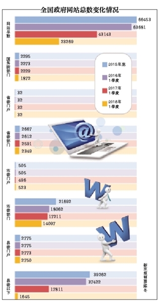 通報顯示,截至2018年3月1日,全國正在運行的政府網站23269家,其中,國務院部門及其內設、垂直管理機構政府網站1872家,省級政府門戶網站32家,省級政府部門網站2349家,市級政府門戶網站523家,市級政府部門網站14097家,縣級政府門戶網站2750家,縣級以下政府網站1645家。