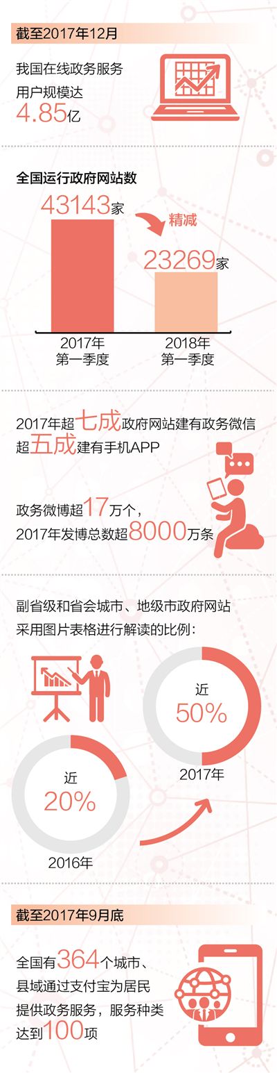 普查、抽查、整改、創(chuàng)新,這些年,全國(guó)政府網(wǎng)站“四不”問題基本解決,《政府網(wǎng)站發(fā)展指引》為網(wǎng)站怎么開辦提供高標(biāo)準(zhǔn)“施工圖”,網(wǎng)站管理水平和政務(wù)服務(wù)能力不斷提升。截至今年3月1日,全國(guó)運(yùn)行政府網(wǎng)站數(shù)達(dá)23269家。相比2017年第一季度的43143家,不到一年時(shí)間,體量“精減”一半。其中,縣級(jí)以下政府網(wǎng)站1645家,相比2017年一季度減少九成多。