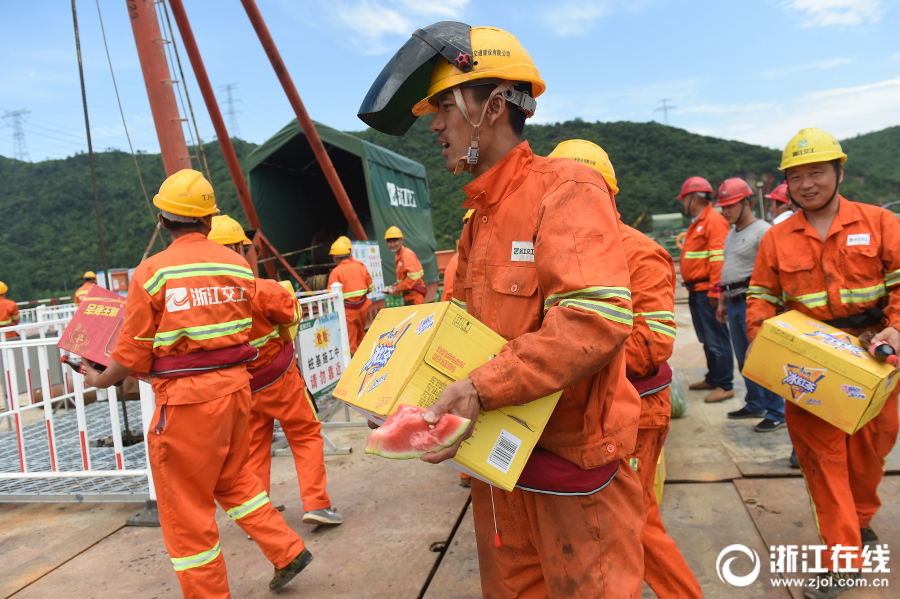 5月16日,杭州持續(xù)高溫,最高氣溫達(dá)37.5℃。在G25長(zhǎng)深高速德清至富陽段擴(kuò)容工地,工人正在抓緊建設(shè)跨富春江大橋。承建施工項(xiàng)目的浙江交工宏途交通建設(shè)有限公司,為一線建設(shè)者送來了清涼用品和防暑藥品,慰問高溫下作業(yè)的施工人員。(浙江在線記者 吳元峰 攝)