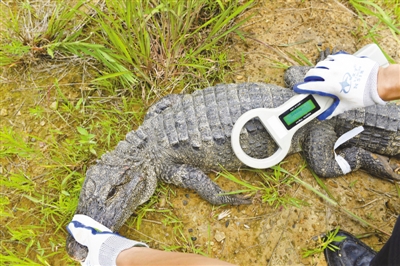 芯片也被稱為電子標(biāo)識(shí)器。電子標(biāo)識(shí)器注入鱷魚(yú)尾部皮下,對(duì)揚(yáng)子鱷的健康沒(méi)有影響。研究人員可以通過(guò)專門的閱讀器讀出其內(nèi)數(shù)碼,方便日后辨識(shí)身份。汪仁平說(shuō):“電子芯片呈米粒形狀,長(zhǎng)約1厘米,芯片上標(biāo)記著它的個(gè)體信息,如身高、體重、年齡等,一旦這條鱷魚(yú)再次被捕捉,通過(guò)閱讀器能迅速確定它的身份。”