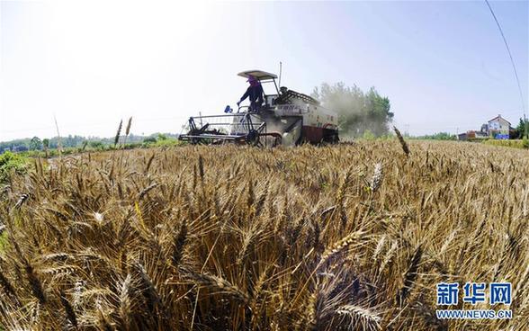 5月23日,在湖北省襄陽市襄城區(qū)尹集鄉(xiāng)尤河村,農民駕駛農機收割小麥。新華社發(fā)(安富斌 攝)