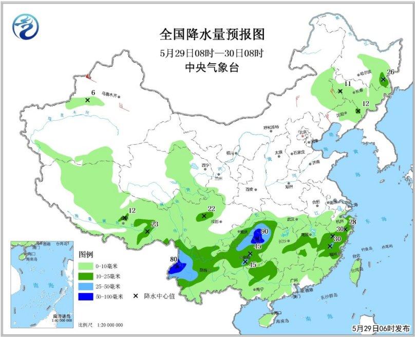 5月29日08時至30日08時,西藏、西南地區(qū)大部、江南、華南大部、黑龍江東部、吉林、遼寧中北部、內(nèi)蒙古東部等地有小到中雨,其中,云南西部、貴州中東部、重慶東南部、湖南西部等地的部分地區(qū)有大雨或暴雨(50~90毫米)。上述部分地區(qū)有短時強(qiáng)降水、雷暴大風(fēng)等強(qiáng)對流天氣。新疆中北部、內(nèi)蒙古東部、東北地區(qū)西部等地的部分地區(qū)有4~6級風(fēng),北疆山口地區(qū)風(fēng)力可達(dá)8~9級。黃海東北部海域、黃海西南部和東南部的部分海域?qū)⒂写箪F,能見度不足1公里。