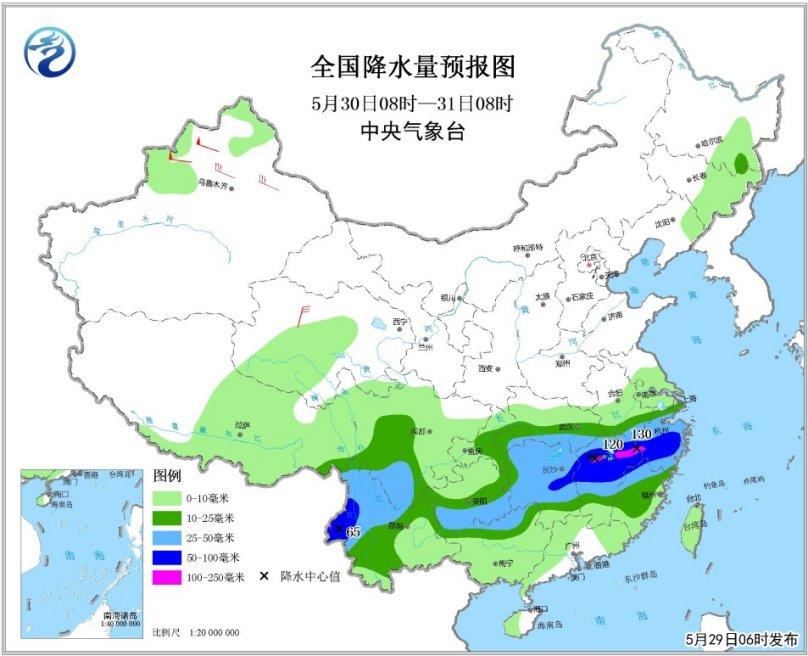 全國降水量預(yù)報圖(5月29日08時-30日08時)