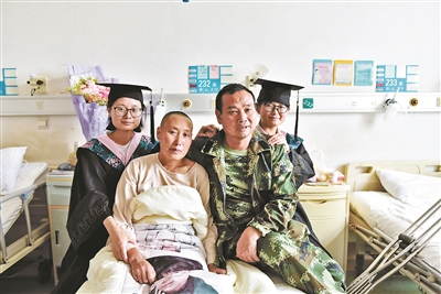 由于母親周玉梅需要在病床上休息,經(jīng)過(guò)醫(yī)生同意后,李夢(mèng)楠花20元為母親租了輪椅,在醫(yī)院的樓道和病房里與同學(xué)們一起拍了合影。照片里,周玉梅戴上了女兒的學(xué)士帽,微笑著面對(duì)鏡頭。