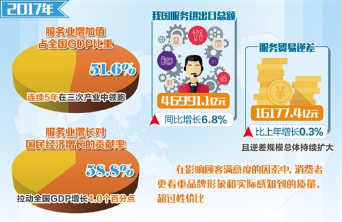 服務(wù)業(yè)是現(xiàn)代化經(jīng)濟體系建設(shè)的關(guān)鍵領(lǐng)域。統(tǒng)計數(shù)據(jù)顯示,2017年,服務(wù)業(yè)增加值占全國GDP比重為51.6%,連續(xù)5年在三次產(chǎn)業(yè)中領(lǐng)跑,服務(wù)業(yè)增長對國民經(jīng)濟增長的貢獻率為58.8%,拉動全國GDP增長4.0個百分點。