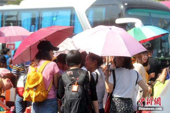 5月31日,北京遭遇高溫天氣。北京西站廣場候車民眾撐傘防曬。 中新社記者 張宇 攝