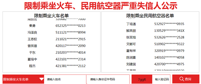 5月1日,國家發(fā)改委、鐵路總公司、民航局等部門聯(lián)合發(fā)布的《關(guān)于在一定期限內(nèi)適當(dāng)限制特定嚴(yán)重失信人乘坐火車 推動社會信用體系建設(shè)的意見》和《關(guān)于在一定期限內(nèi)適當(dāng)限制特定嚴(yán)重失信人乘坐民用航空器 推動社會信用體系建設(shè)的意見》正式實(shí)施。與此同時(shí),中國鐵路總公司發(fā)布的《關(guān)于限制鐵路旅客運(yùn)輸領(lǐng)域嚴(yán)重失信人購買車票的管理辦法》同步實(shí)施。