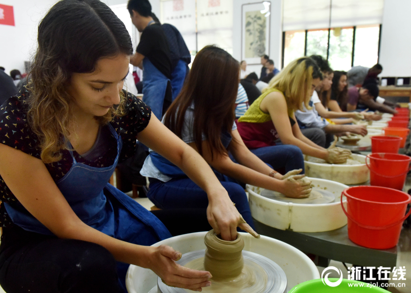 2018年6月3日,來自30多個(gè)國(guó)家的70多名留學(xué)生,在武義漢坊婺窯體驗(yàn)館開心學(xué)習(xí)拉坯。