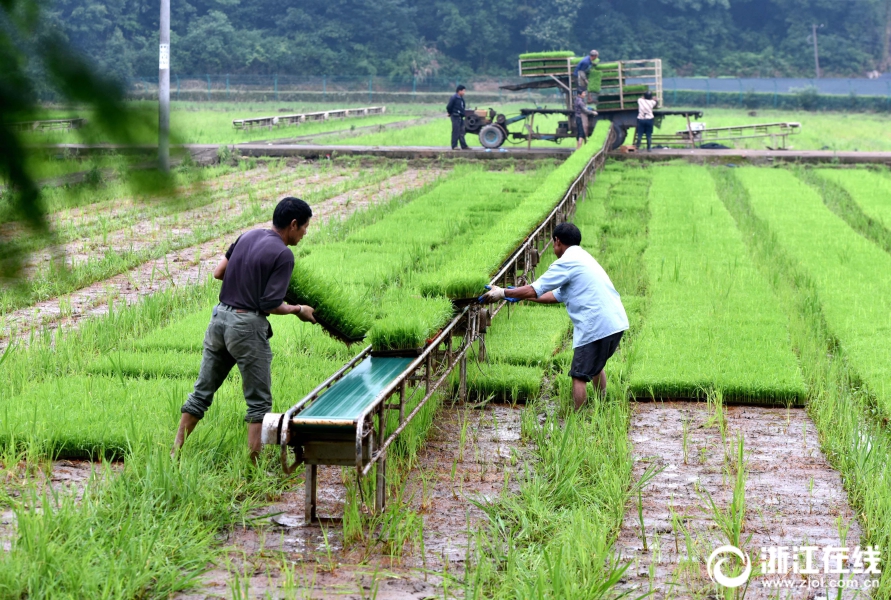 武義縣一育秧工廠員工忙著為訂單農(nóng)戶起運(yùn)單季稻秧苗。
