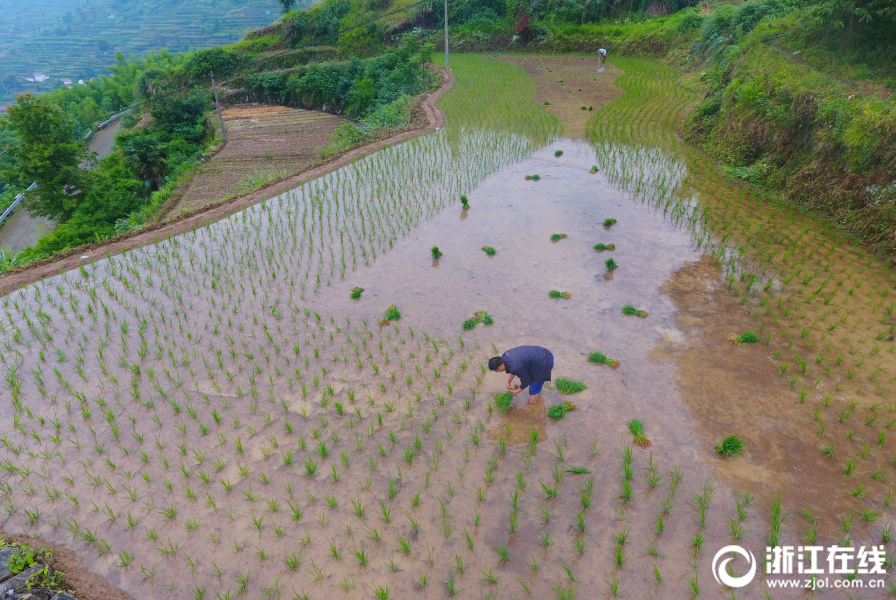 武義縣新宅鎮(zhèn)大萊村一農(nóng)戶(hù)在梯田上手工插種單季稻。