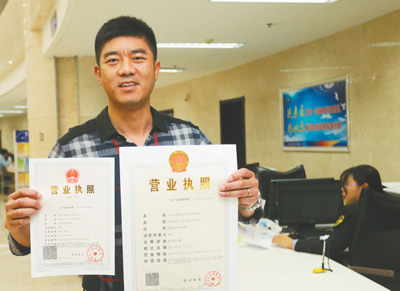 近日,山東省榮成市行政審批局正式掛牌成立,現(xiàn)場(chǎng)封存了相關(guān)部門29枚原審批專用章,“榮成市行政審批局”公章啟用。圖為榮成市市民領(lǐng)取一張加蓋“榮成市行政審批局”公章的營(yíng)業(yè)執(zhí)照。王福東 攝