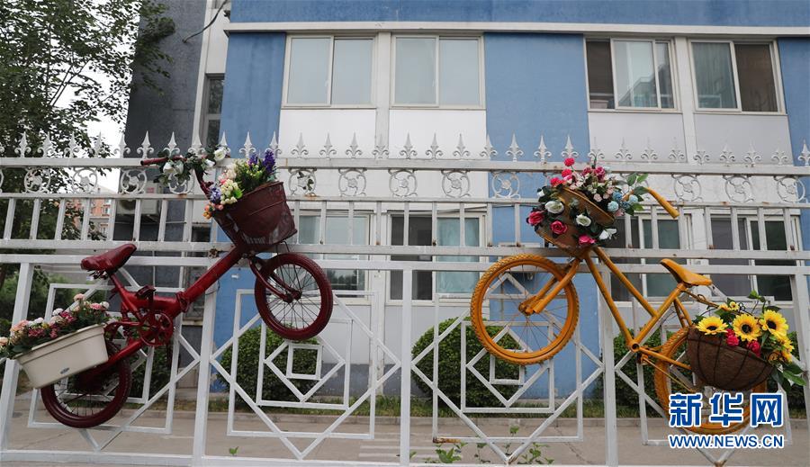 6月9日,豐臺區(qū)花鄉(xiāng)天倫錦城社區(qū)里居民自己制作的用廢舊自行車改造的裝飾品。