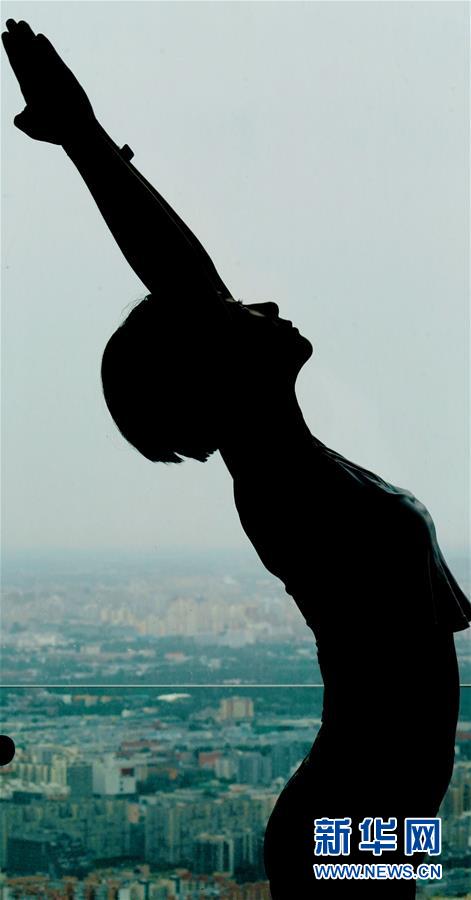 當(dāng)日,數(shù)名瑜伽愛好者在專業(yè)瑜伽教練的帶領(lǐng)下在北京國貿(mào)大酒店70層以上的高樓層練習(xí)瑜伽,體驗(yàn)高空練習(xí)瑜伽的樂趣。