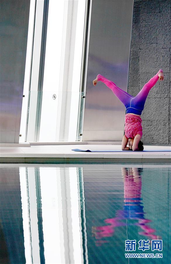 6月9日,在北京國(guó)貿(mào)大酒店78層游泳館,瑜伽愛(ài)好者練習(xí)瑜伽。
