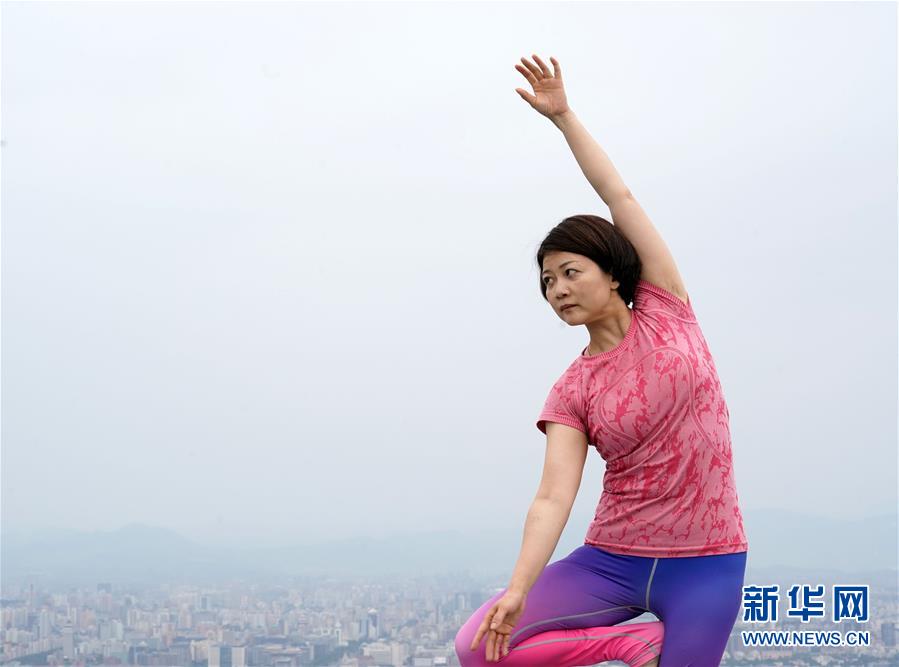 6月9日,在北京國貿(mào)大酒店頂層的83層停機(jī)坪,一名瑜伽愛好者在練習(xí)瑜伽。