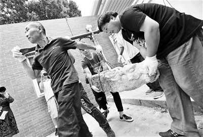在昨天的文物搬運(yùn)現(xiàn)場,兩位工人挑擔(dān)子,兩位工人用手托住龍頭兩邊,四人費(fèi)了好大勁才將螭頭搬到車上,開啟“回家”之路。待螭頭到達(dá)圓明園后,將有專家對(duì)它們進(jìn)行全身“體檢”,制定修復(fù)方案。“這些螭頭有一些小裂縫,如果不好好保護(hù),時(shí)間久了容易出問題?!眻A明園文物考古科科長陳輝說。(記者 李夢婷)