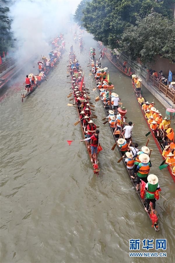 6月14日,多個村的龍舟隊在廣州市天河區(qū)一處河道劃龍舟。當(dāng)日,廣州市天河區(qū)舉行一場熱鬧歡快的龍舟活動,來自多個村莊“走親戚”的龍舟隊參加。按廣州的傳統(tǒng)習(xí)俗,每年農(nóng)歷五月初一至初五,各村的龍舟隊要到周圍村落“走親戚”。走親戚的龍舟隊到來時,受訪村子要準(zhǔn)備好龍舟飯招待來客?;顒赢?dāng)天,鳴炮敲鑼,一派喜慶氣氛。新華社記者 張加揚 攝